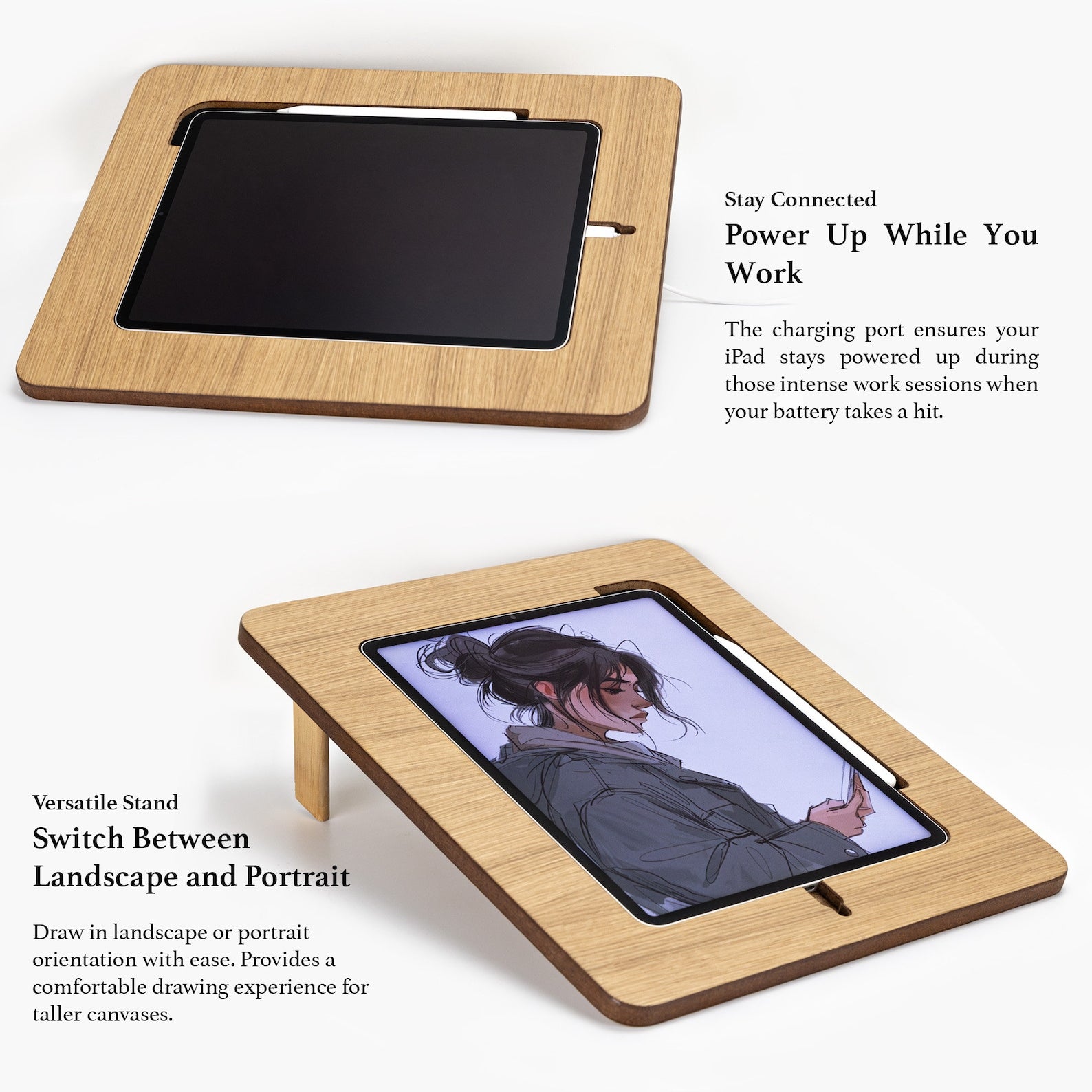 • Charge while you create with an accessible port for your charging cable and built-in Pencil Holder for wireless Apple pencil charging.