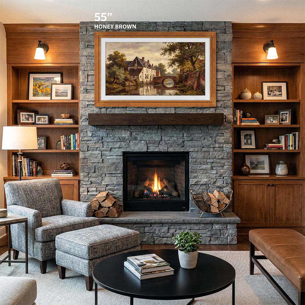 This solid oak TV frame by EventFrame is designed to make your television part of the interior rather than a distraction. Crafted from premium oak veneer and finished with a subtle engraved line detail, it fits naturally into modern, rustic, and classic spaces.